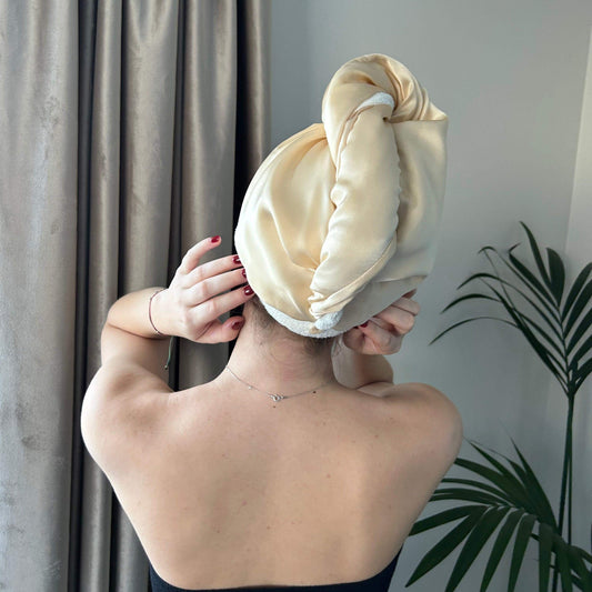 Smėlinis dvipusis šilkinis plaukų rankšluostis