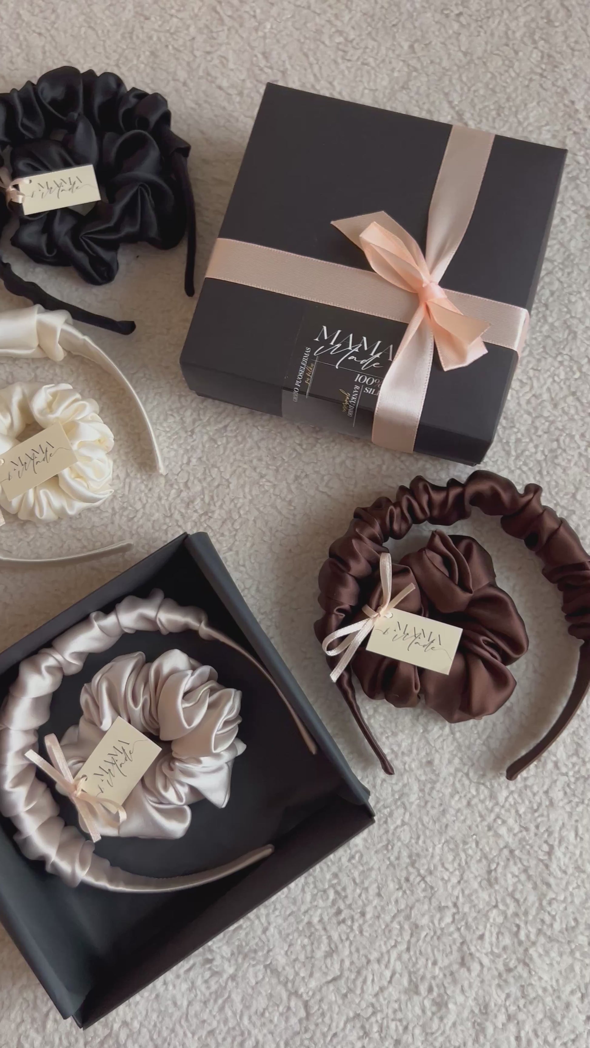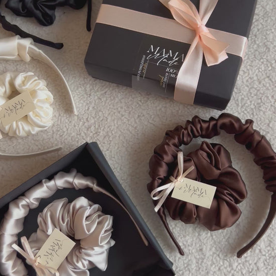 Šilkinio plaukų lankelio ir gumytės komplektas - elegantiškas ir prabangus pasirinkimas dovanai. Rinkinį sudaro 100% natūralaus Mulberry šilko plaukų lankelis ir mini arba maxi dydžio šilkinė plaukų gumytė.